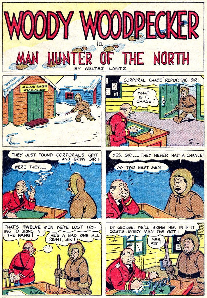 The publisher found out early they couldn't just reproduce animated cartoons. The characters got into adventures and stories unlike the movie cartoons. Even with that editorial policy the first issue of Woody Woodpecker, in Dell Four Color #169 from 1947, while entertaining enough, seems jarring. John Stanley, of Little Lulu fame, is credited with this issue. "Man Hunter," which is 29 pages long, seems like a stretched out 10-pager. There are jokes, even Stanley's "Yow!" to assure us he wrote it, but my feeling about this story is that it seems generic, that you could take Woody out, insert Bugs Bunny, Andy Panda or Porky Pig and they'd fit just fine.