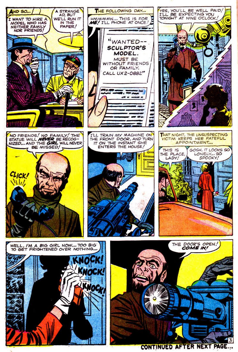 Jack Kirby and Dick Ayers drew the story. I get a kick out of Moomba not because it's a monster story (typical for the era), but because of the title. Marvel used some creative names for the monsters: Vandoom, Fin Fang Foom, Groot, and my favorite, Tim Boo Ba. "Moomba" is in that rich tradition of ridiculous sobriquets with the "oo" sound."The Strange Fate Of the Statue Maker", drawn by Kirby and Paul Reinman, has a typically outrageous plot: inventor builds ray that turns the living into stone.* What got my attention wasn't that silliness, but the ad the scientist placed, "Wanted -- Sculptor's Model. Must be without friends or family." A girl would be really smart to answer that ad, wouldn't she?