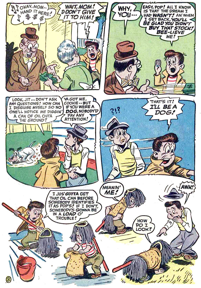 Dan Gordon, who sometimes signed his name dang, was a talented animator and comic book artist who worked for ACG on their humor books. Cookie is a funny Archie-style teenage comic. Gordon's fluid drawings move the eye quickly across and down the page (a good example is page six of "Cookie's Oil Company," in a borderless sequence of Cookie sleepwalking). To show his technical drawing ability, page four features a large bird's-eye view perspective drawing.