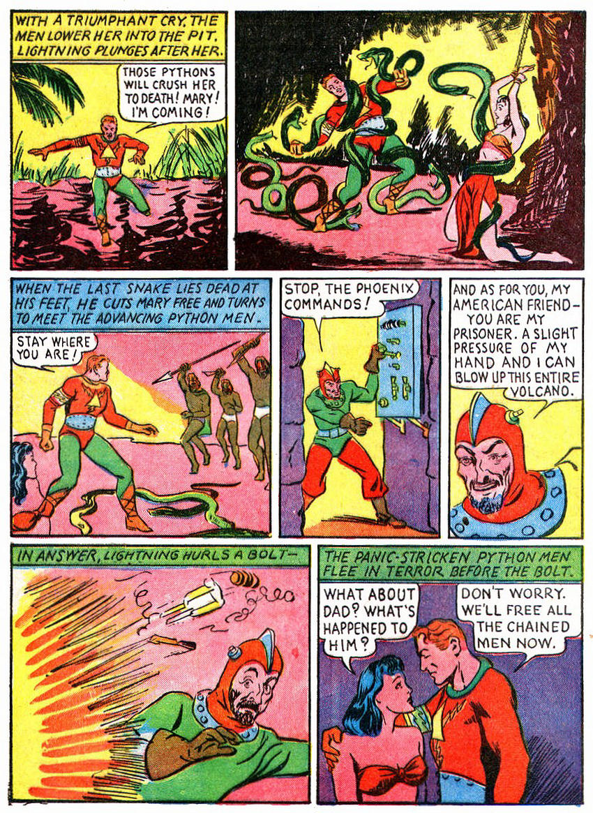 The Grand Comics Database lists Robert Turner as writer. There is an indexer note that the story is based on the May 1938 pulp magazine, Captain Hazzard. A lack of originality in the story is matched by swipes from Alex Raymond’s Flash Gordon by artist Harry Lucey. A year or so later Flash’s name became Lash Lightning, and while I can’t find official information on the reason for the change, it’s likely DC Comics’ character, the Flash, had something to do with it. Another name change came with the comic book title, which after four issues as Sure-Fire Comics became Lightning Comics. Like many other superheroes born in the wake of Superman, Flash/Lash Lightning disappeared shortly after the end of the war. Had I been in charge of him in 1946 I might have taken away the super powers and made Lash Lightning a private eye with a whip. He couldn’t be a cowboy, because Lash LaRue was already whipping up bad guys in the Western B-movies in which he starred.