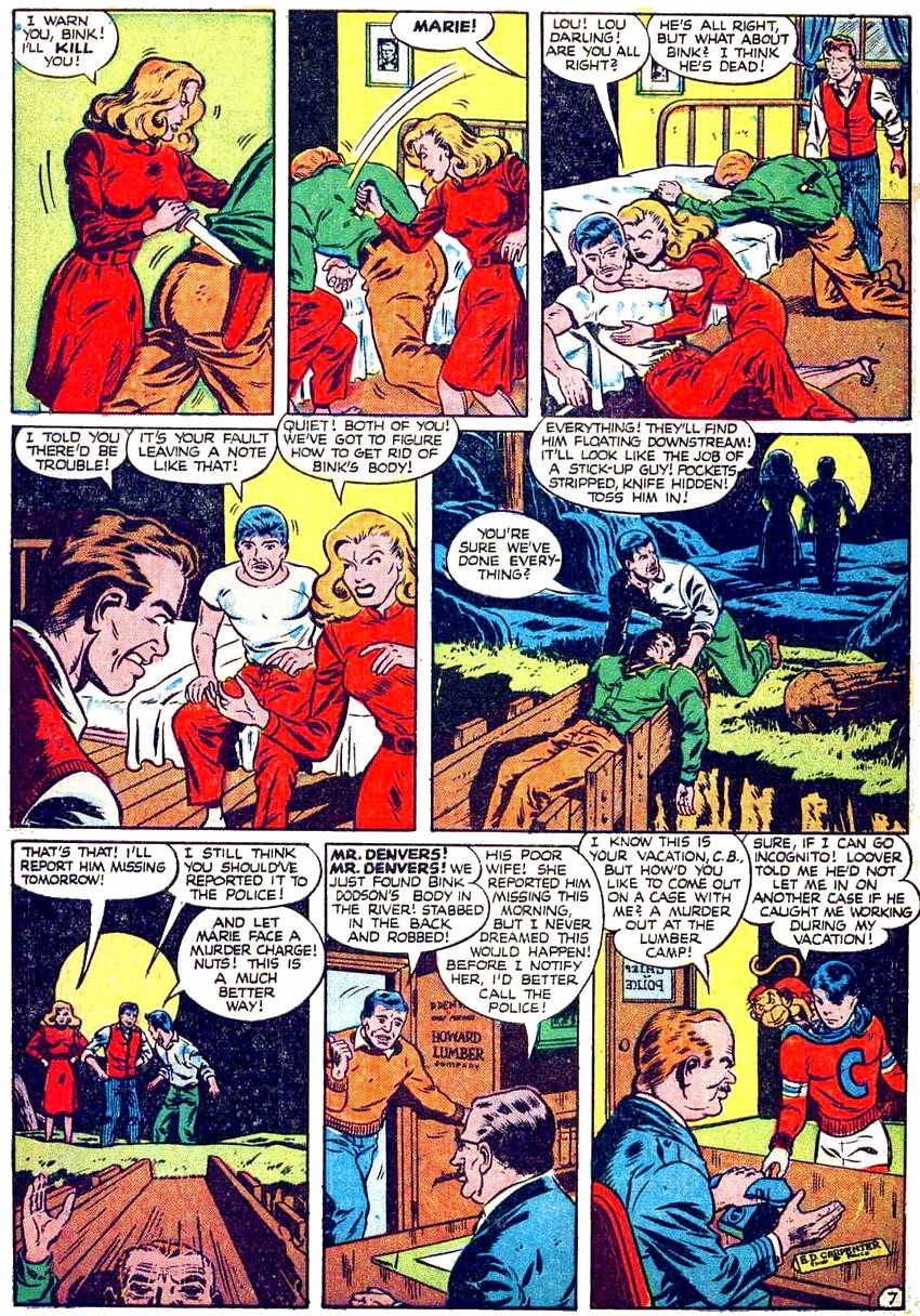 There should be a lesson in this crime story from Boy Comics #32 (1947) but I'm darned if I know exactly what it is. Regarding the two college dropouts who ride the rails to a logging camp looking for a meal and end up with jobs, it could be there is danger there, and not just because being a lumberjack is a really dangerous job. It also has to do with not messing with the boss's wife, especially a blonde who dresses in nylons and high heels in a logging camp and longs to see the sights of New York. Or it could be the lesson that some people — like the boss's wife — will stab someone in the back. Literally. Finally, it could be that an executed prisoner should be checked for signs of life before putting him in a coffin.